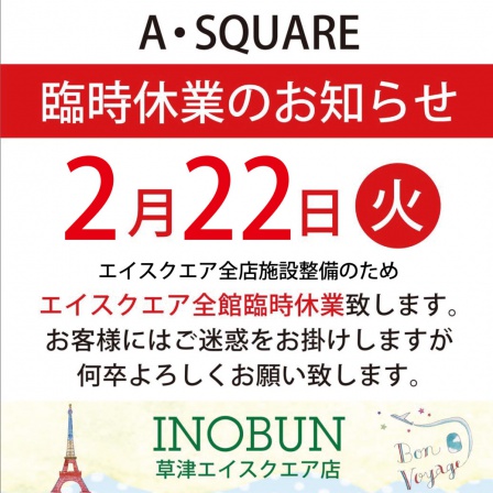 2月22日(火)はエイスクエア全店施設整備の為、エイスクエア全館休業いたします。